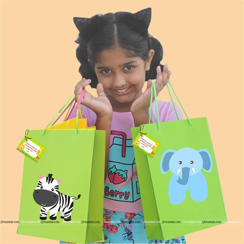 Customized return gift bag based on the theme. White bag with a theme based customized sticker on the front side.