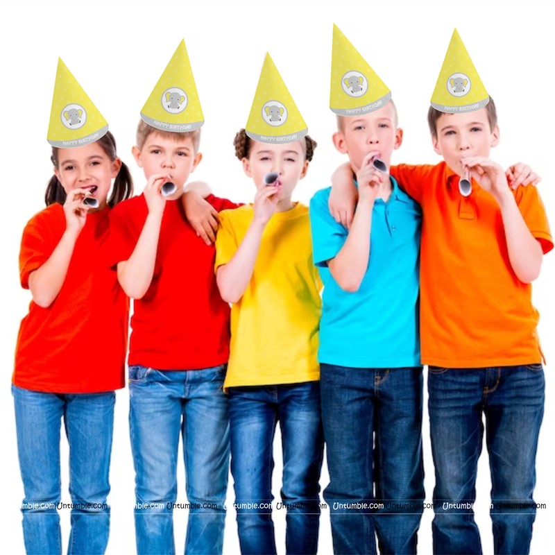 A party is incomplete without hats. These fully customized hats are printed to the theme and can incorporate a name and a snippet of text.