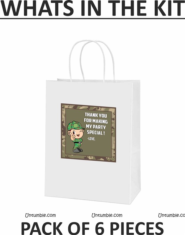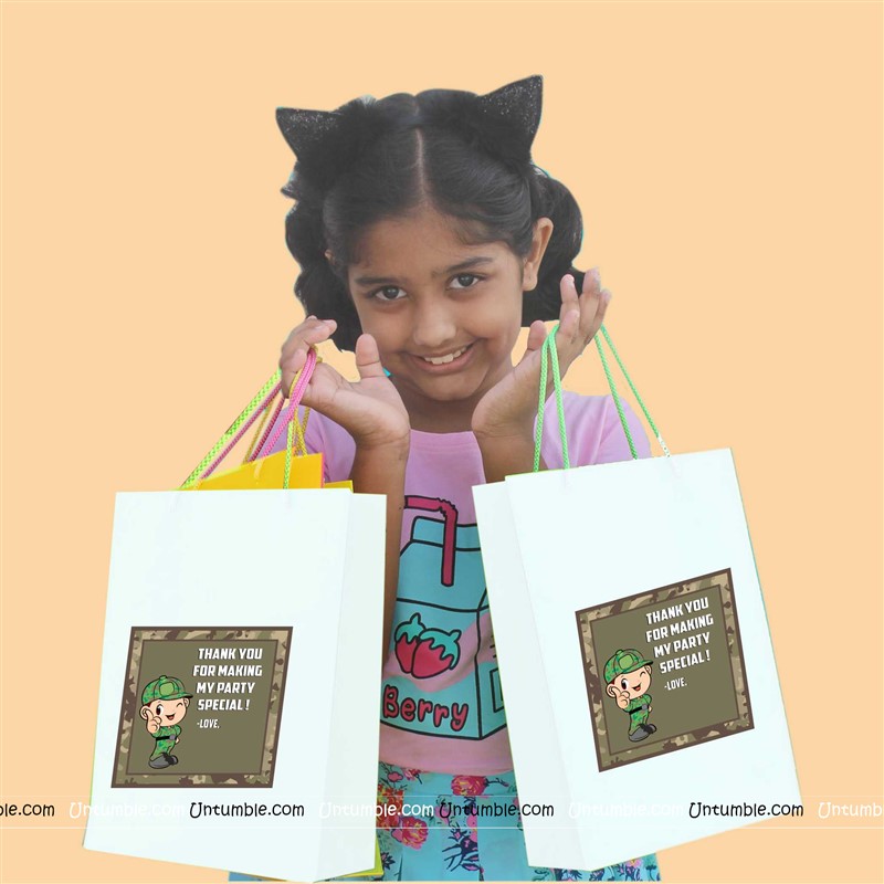 Customized return gift bag based on the theme. White bag with a theme based customized sticker on the front side.