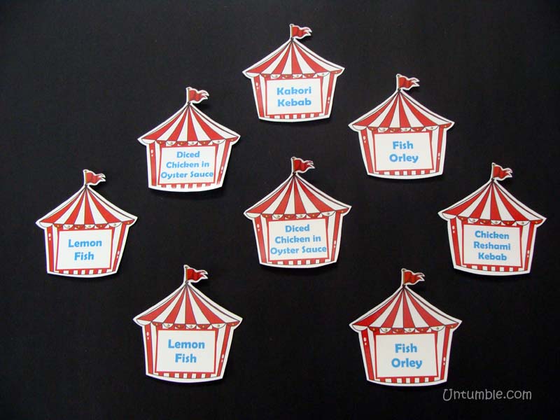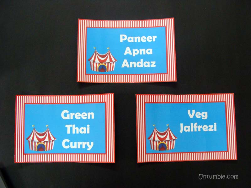 Theme based food labels that has the menu item printed on it.