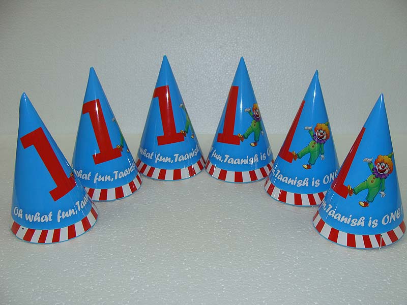 A party is incomplete without hats. These fully customized hats are printed to the theme and can incorporate a name and a snippet of text.
