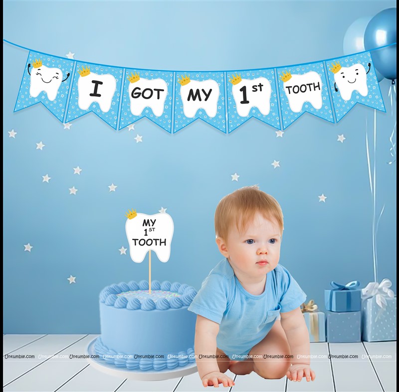 Blue First Tooth Banner, Cake Topper and Poster Kit ( Pack of 4)