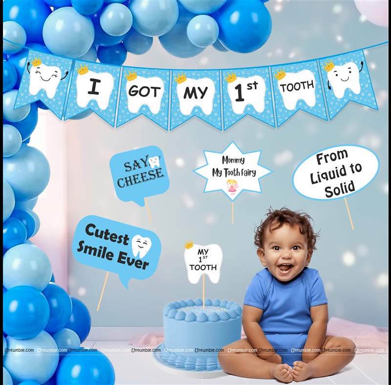 Blue First Tooth Banner and Cake Topper Kit (Pack of 2 Pcs)
