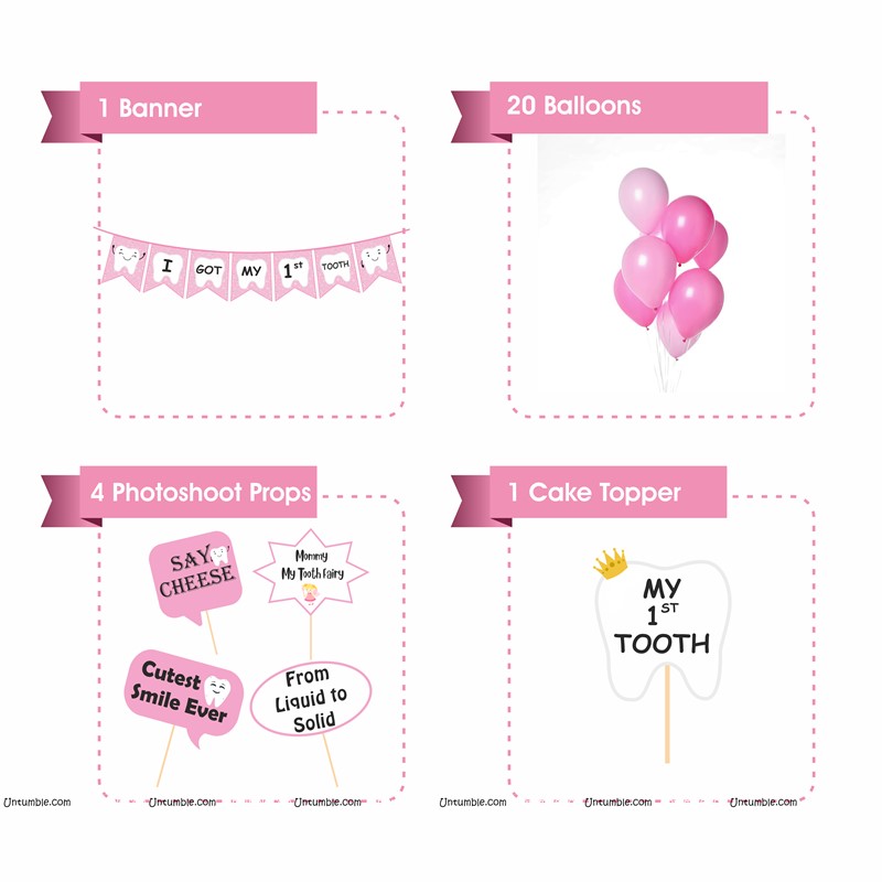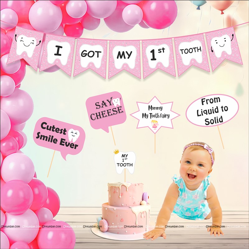 Pink First Tooth Banner, Cake Topper and Poster Kit ( Pack of 4)