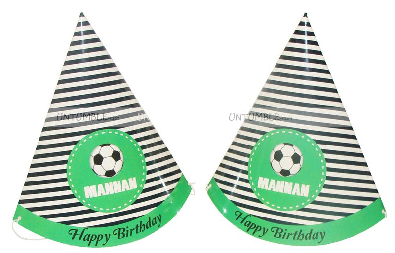 A party is incomplete without hats. These fully customized hats are printed to the theme and can incorporate a name and a snippet of text.