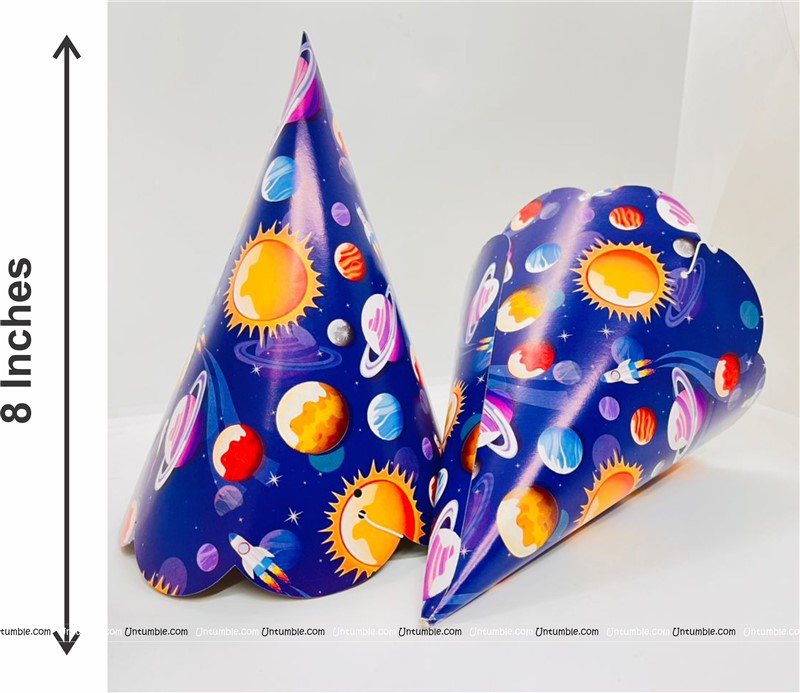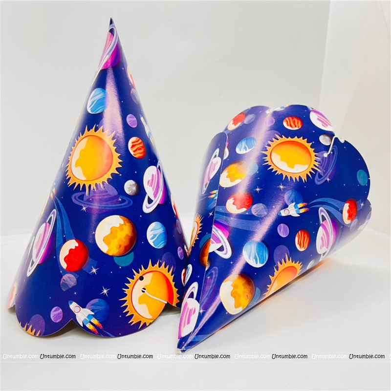 A party is incomplete without hats. These fully customized hats are printed to the theme and can incorporate a name and a snippet of text.