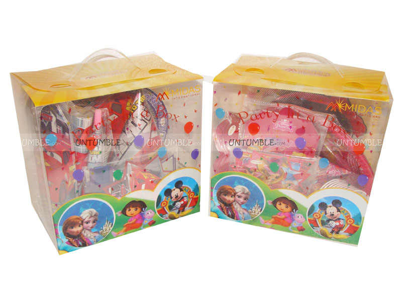 Thoughtfully created party kits for a small house party without other kids. Contains decor and props for a party at home with family.