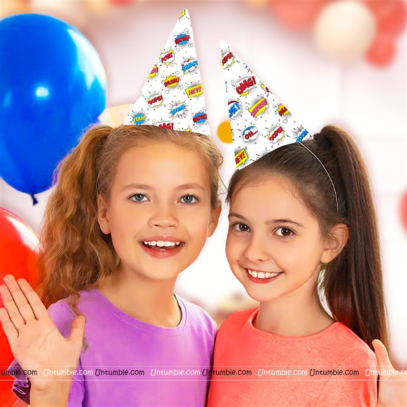 A party is incomplete without hats. These fully customized hats are printed to the theme and can incorporate a name and a snippet of text.