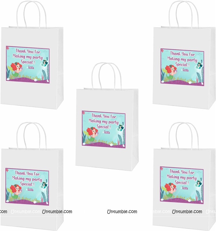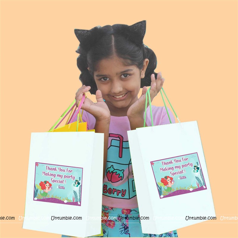 Customized return gift bag based on the theme. White bag with a theme based customized sticker on the front side.