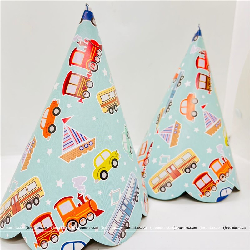 A party is incomplete without hats. These fully customized hats are printed to the theme and can incorporate a name and a snippet of text.