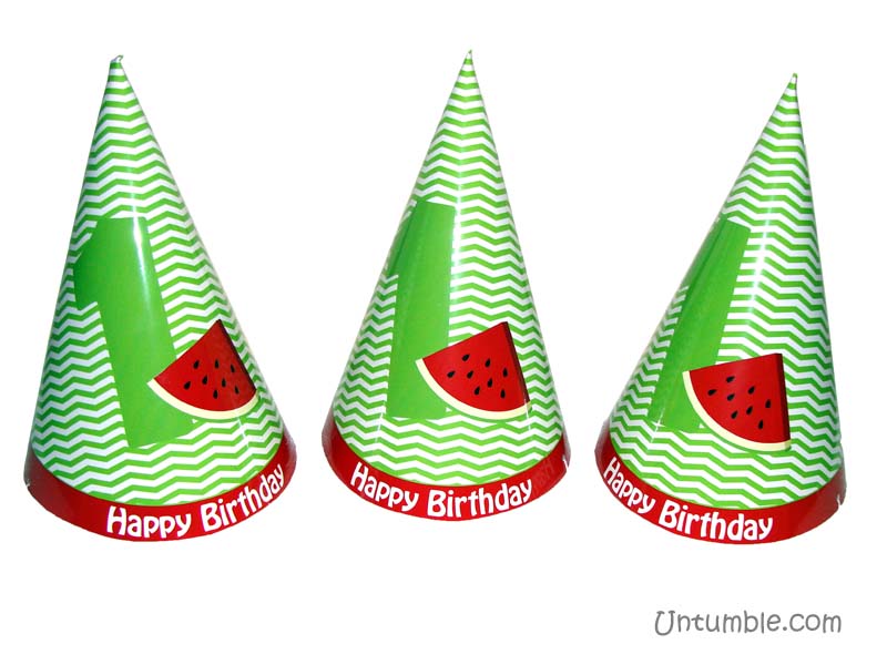 A party is incomplete without hats. These fully customized hats are printed to the theme and can incorporate a name and a snippet of text.