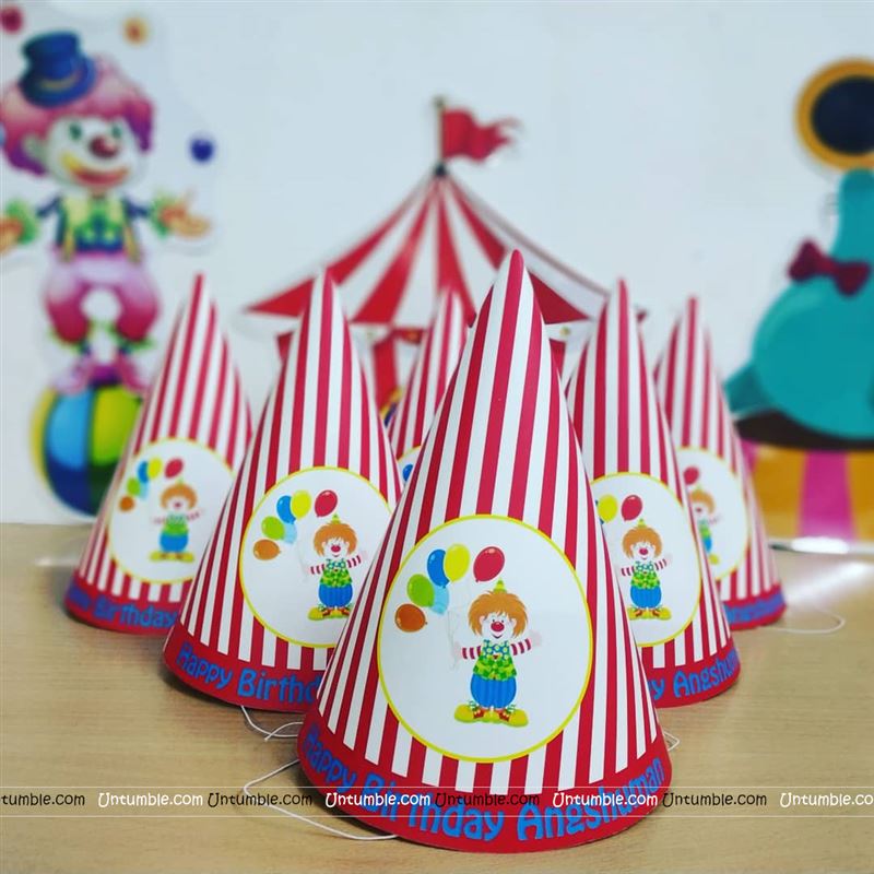 Circus carnival theme party supplies for your child's Circus party. Clown printed party hats and Circus posters to brighten up your Circus party