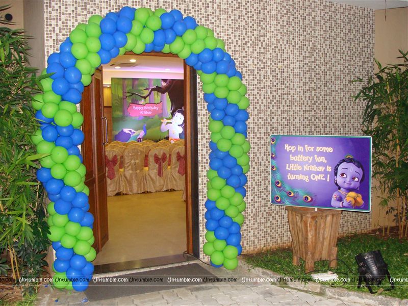Krishna theme birthday Entrance decor with balloon arch made of green and blue balloons and a welcome poster personalised with the baby name