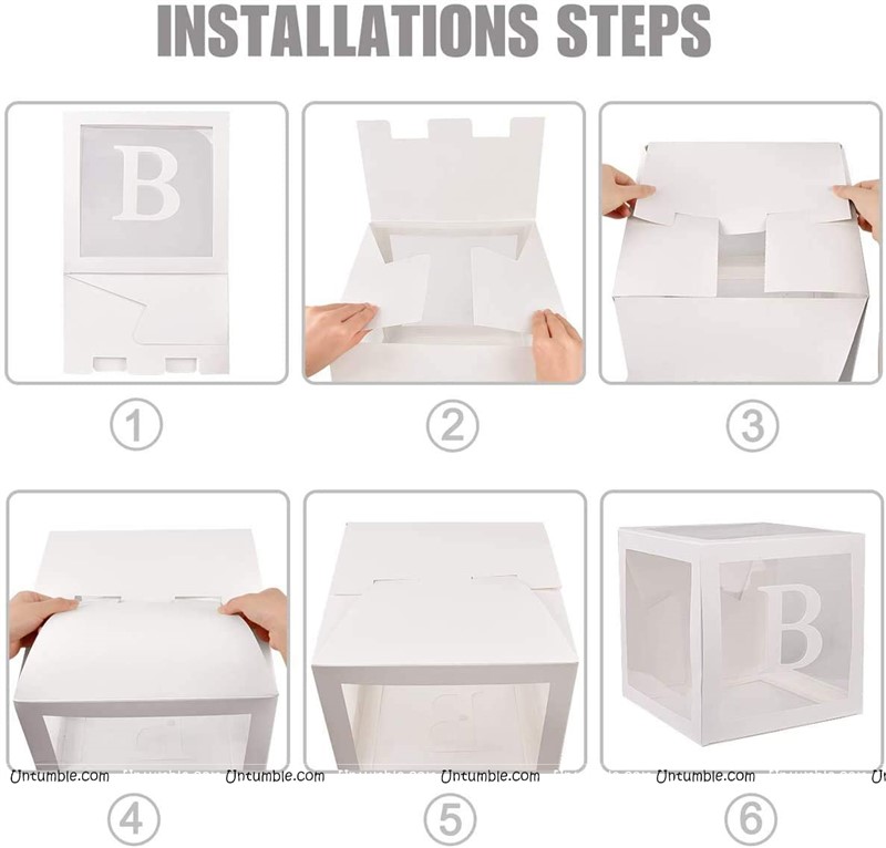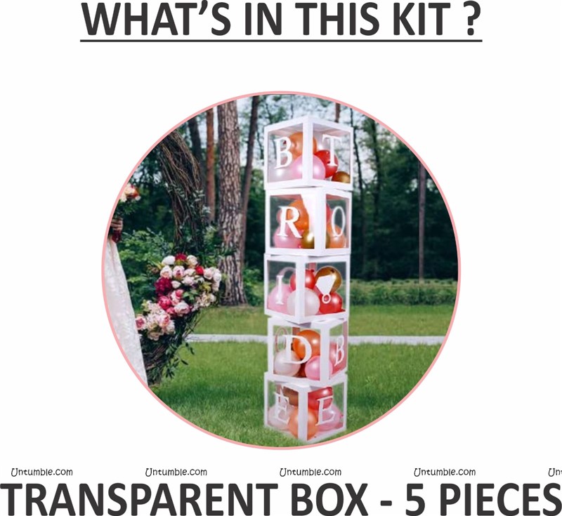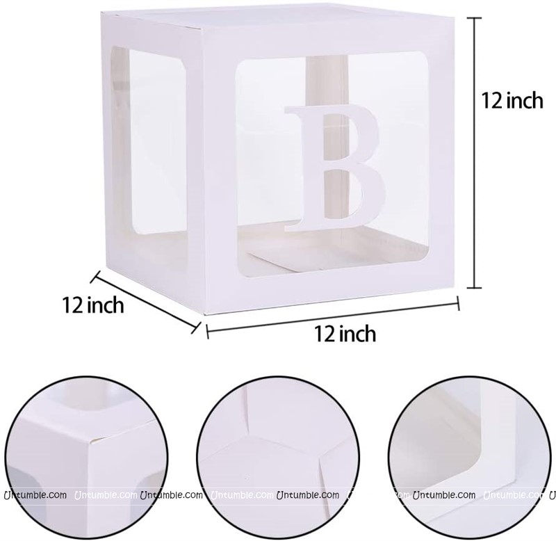 Transparent Letter boxes for balloons. Cube shaped boxes that can hold balloons with some text stuck on the sides. Used for Birthdays & Baby showers. ONE box available in white, blue and pink.#One ballon