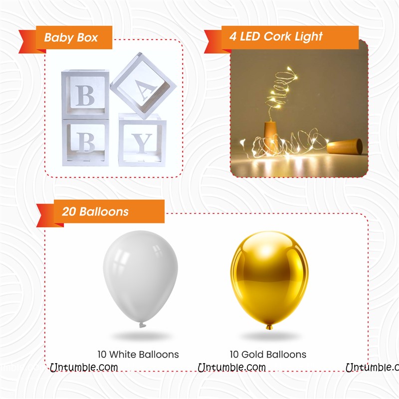 Transparent Letter boxes for balloons. Cube shaped boxes that can hold balloons with some text stuck on the sides. Used for Birthdays & Baby showers. ONE box available in white, blue and pink.