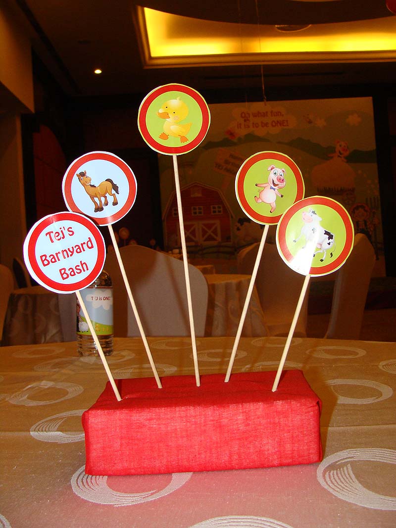 Several different options to pick from - 1. Skewers with toppers poked on a thermocol base or cup cakes2. Sided artboard centerpiece