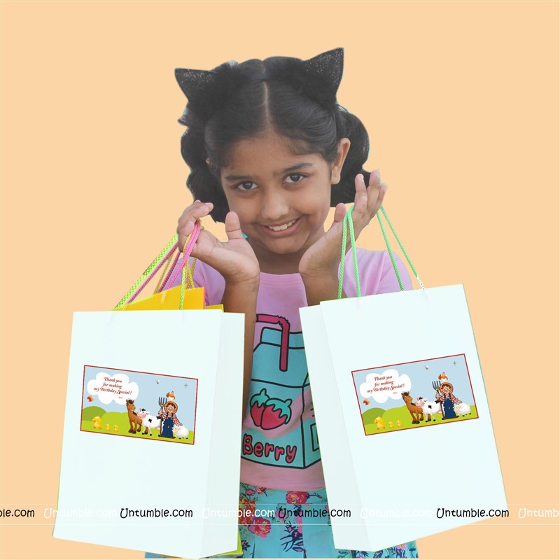 Customized return gift bag based on the theme. White bag with a theme based customized sticker on the front side.