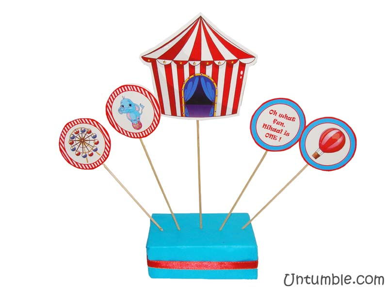 Several different options to pick from - 1. Skewers with toppers poked on a thermocol base or cup cakes2. Sided artboard centerpiece