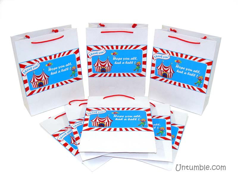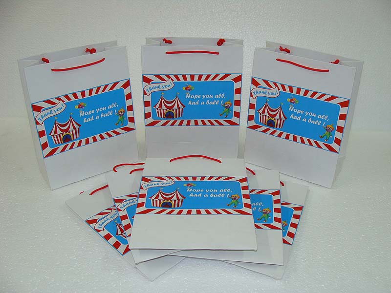 Customized return gift bag based on the theme. White bag with a theme based customized sticker on the front side.