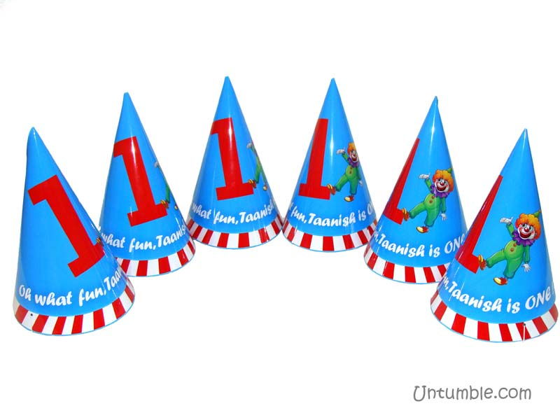 A party is incomplete without hats. These fully customized hats are printed to the theme and can incorporate a name and a snippet of text.