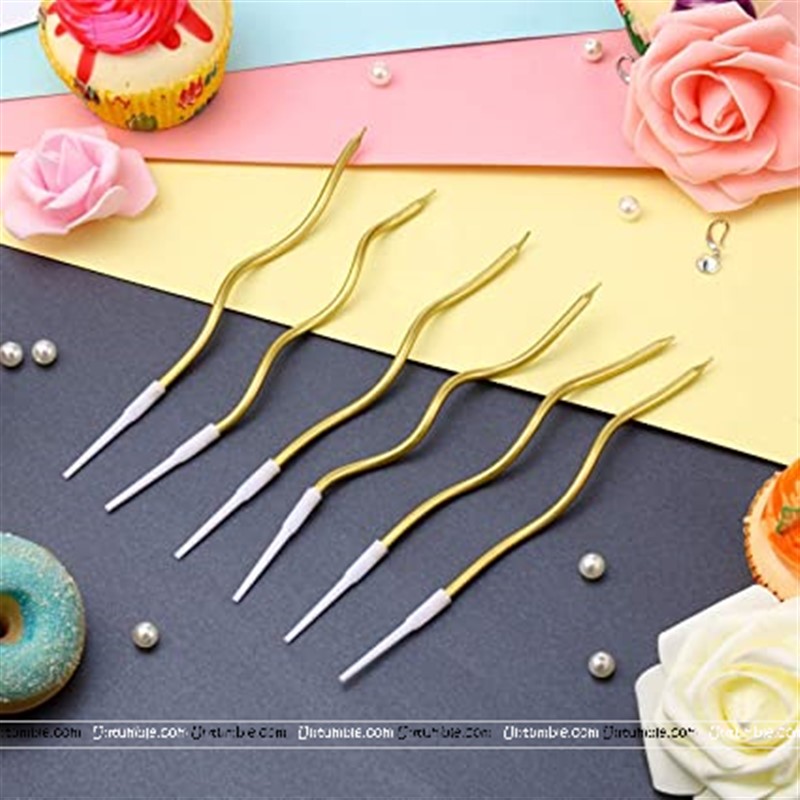 Includes 6 curly candles in a chrome finish gold shade to adorn wedding and birthday cakes.