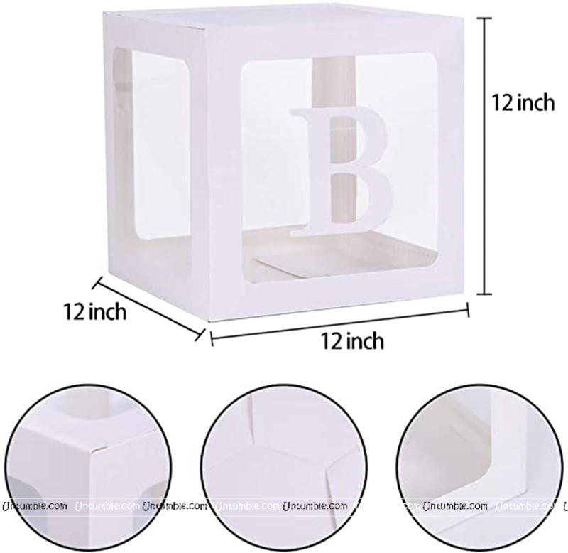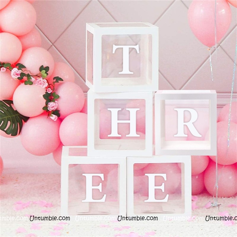 Transparent Letter boxes for balloons. Cube shaped boxes that can hold balloons with some text stuck on the sides. Used for Birthdays & Baby showers. ONE box available in white, blue and pink.