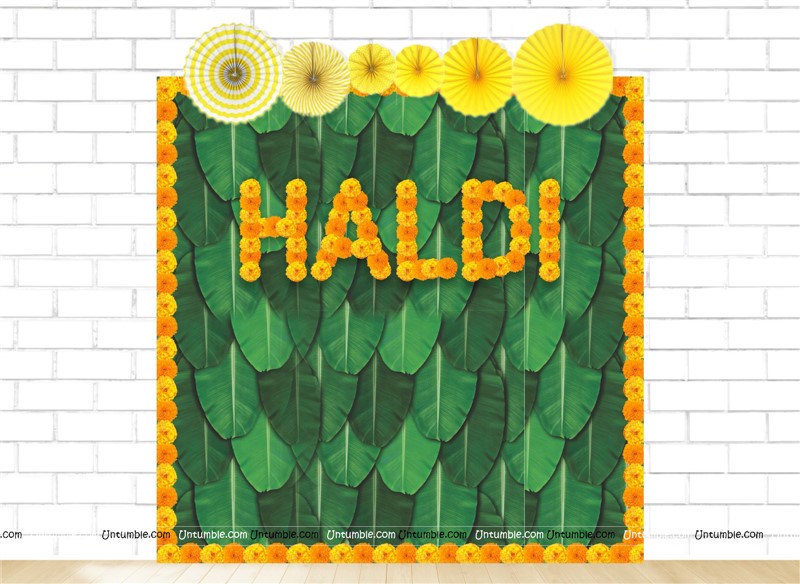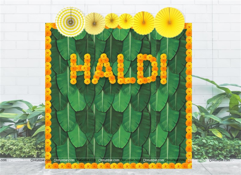 Haldi Ceremony festive Backdrop Banner with a Banana Leaf print on cloth for a stage setup