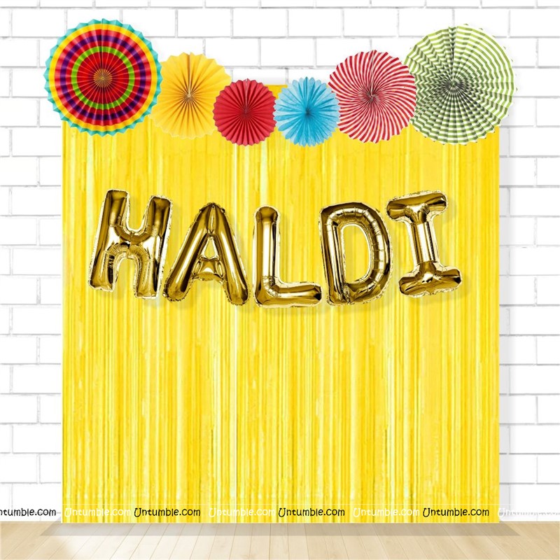 Haldi Foil Balloon and Paper Fan Curtain Kit with Photo Props