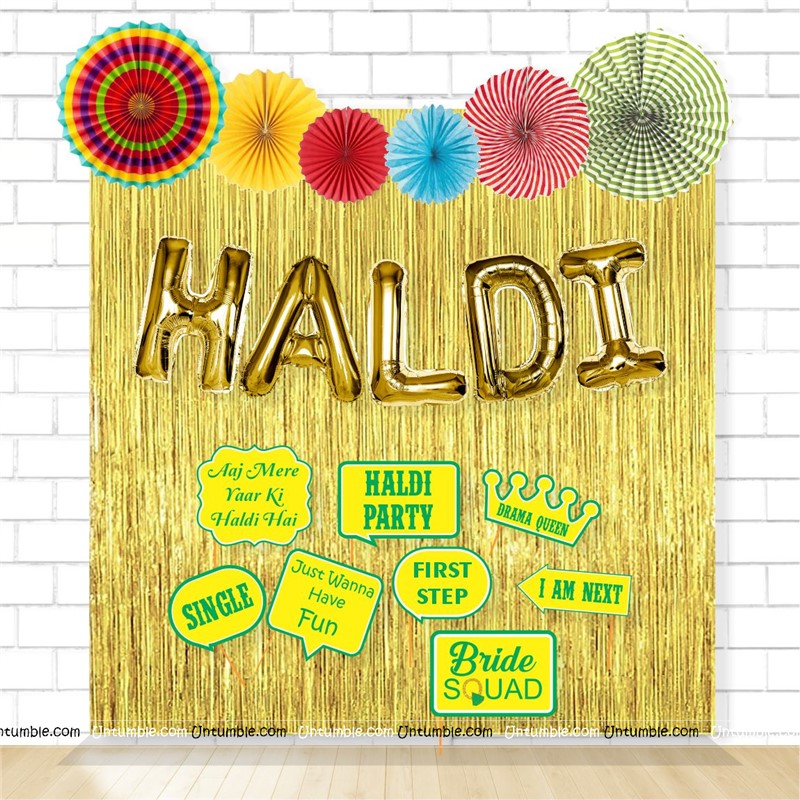 Haldi Foil Balloon and Paper Fan Curtain Kit with Photo Props