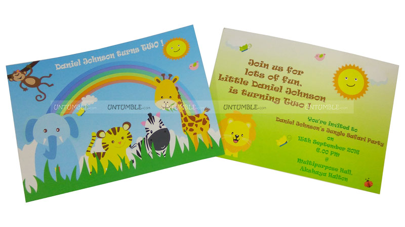 Rectangular invites with single side printing. They come with a white coloured envelope with a theme based sticker on it.